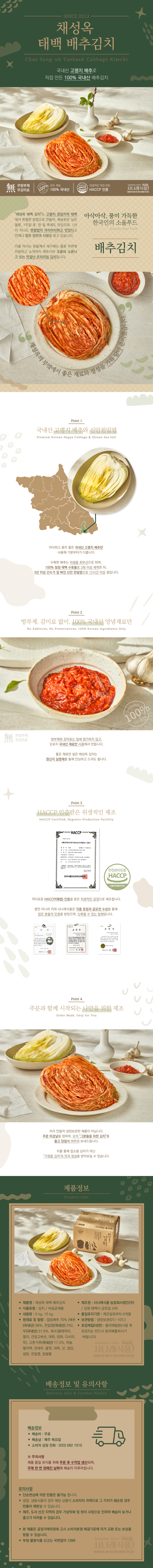 • "채성옥 태백 배추김치"는 미리 만들어 저장고에 보관하지 않고 김치의 신선함을 위해 주문 후 수작업으로 만들어 보내드립니다.
